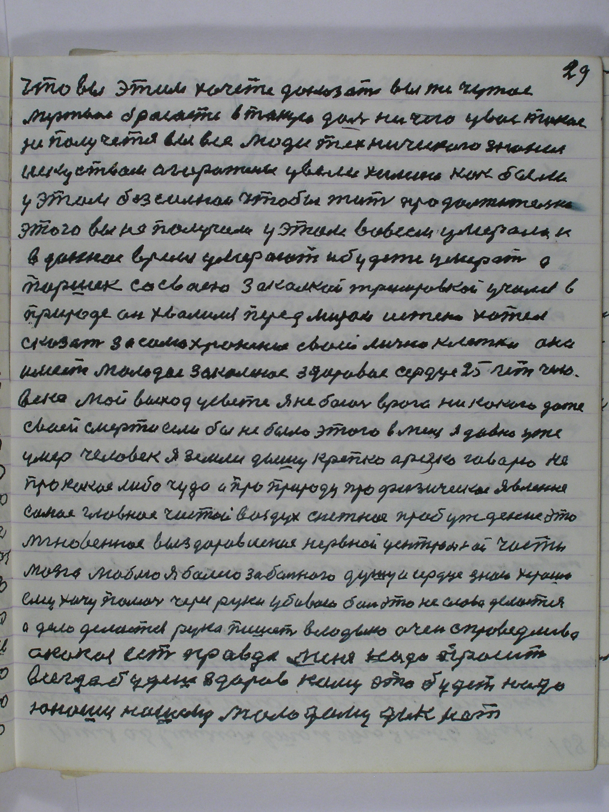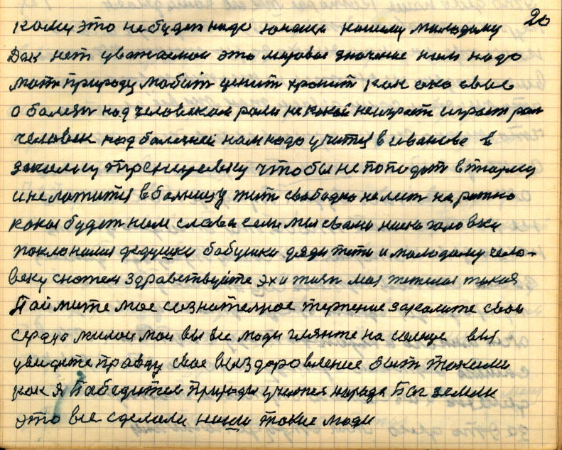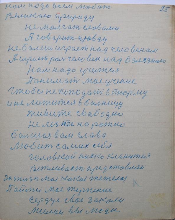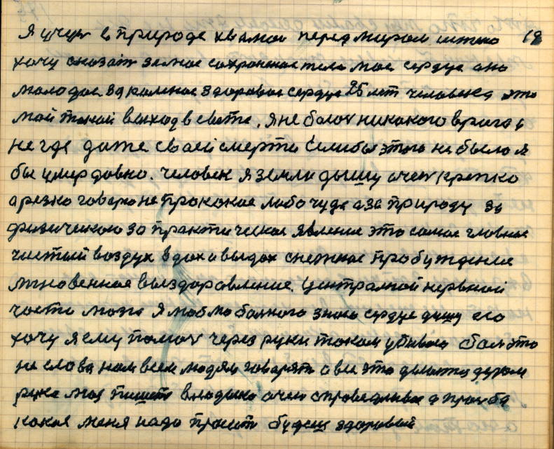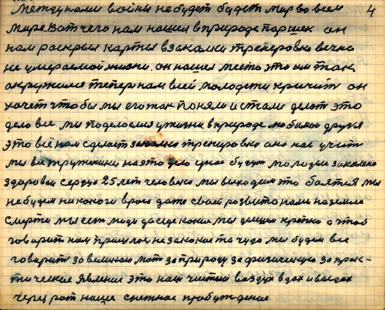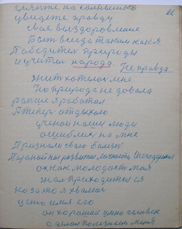 По делу я есть самородок, а источник мой — это закалка-тренировка. Я тружусь один для всего человечества, учусь у Природе, хвалюсь перед нею. Истинно хочу сказать за самосохранение клетки. Мое здоровое, закалённое, молодое сердце — 25-лет человека. Выход у свете, я не боюсь даже врага , даже своей смерти. Если бы этого не было, я бы уже давно умер.