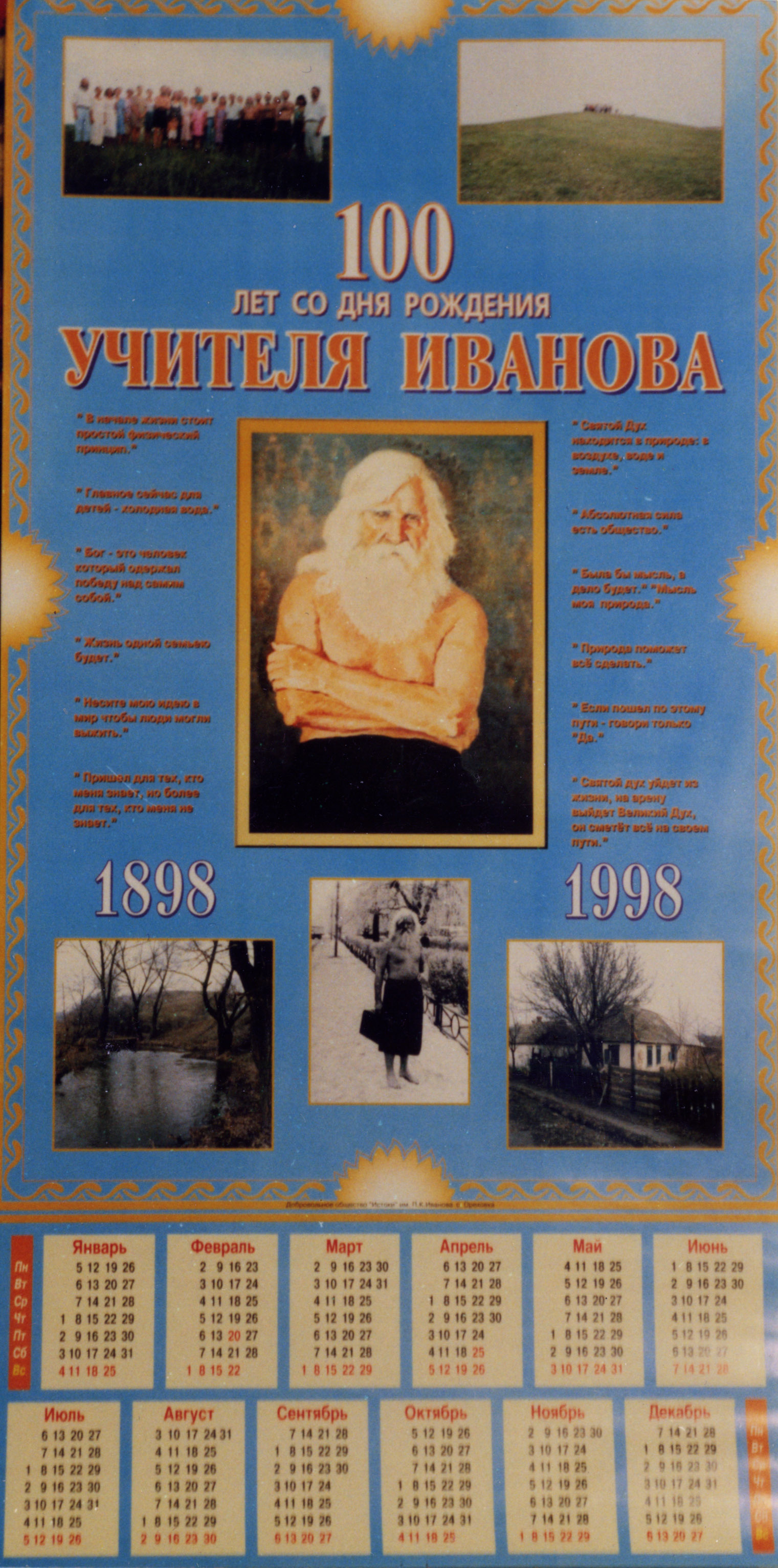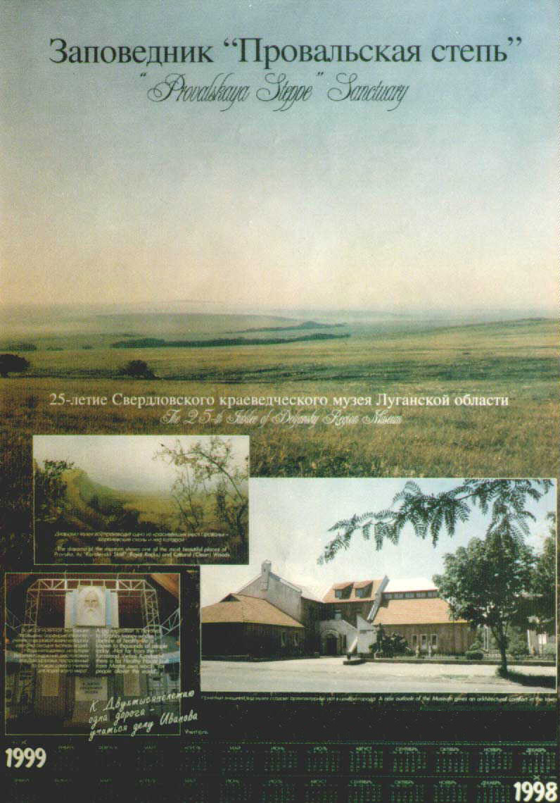 Фотоальбом к столетию со дня рождения Учителя Игорь не выпустил. Сделал только плакат-афишу. Половину плаката занимала фотография степи, над которой была помпезная надпись — Заповедник «Провальская степь». От степи там была узенькая полосочка, да и та находилась под текстом, а всё остальное — небо. Более того, часть этой узенькой полосочки степи закрывала фотография диорамы Королевских скал и леса Катарол, по низу которой красовалась своя надпись. Так что степь рассмотреть было невозможно. Эта же фотография диорамы закрывала угол фотографии краеведческого музея в Свердловске. Была помещена ещё фотография из выставки музея, эта фотография была вся испещрена текстами на русском и английском языке. Внизу плаката был календарь на 1998-1999 год. У Юрия Иванова в это же время тоже был сделан плакат и внизу тоже был календарь. Но у Юры Иванова плакат сделали хотя бы без затрат, никуда не уезжая. Где и кто лепил Игорю этот шедевр, я не знаю. Кому посчастливилось быть обладателями шедевра Игоря, неизвестно. Но тот плакат, который привезли на хутор оказался в чулане для угля, когда-то там была ванна, в которой мылся Учитель. А карту Луганской области через 2 года директриса краеведческого музея подарила мне.